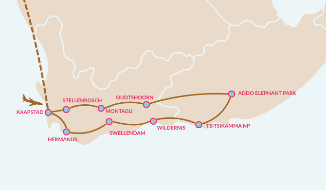 Droom je van een onvergetelijke camperreis langs adembenemende kusten, indrukwekkende bergpassen en het spotten van wilde dieren? Met deze camperreis vanuit Kaapstad rijd je door de mooiste landschappen van Zuid-Afrika, van de ruige kustlijn tot de weidse Karoo en de weelderige bossen van de Tuinroute. Beleef de magie van de beroemde Chapman’s Peak Drive, spot pinguïns op Boulders Beach en proef de lekkerste wijnen in de schilderachtige wijnlanden. Rijd door de spectaculaire Swartbergpas naar Oudtshoorn, waar je oog in oog staat met struisvogels en de mysterieuze Cango Caves kunt verkennen. Geniet van de ongerepte natuur in Tsitsikamma National Park en ervaar een ultiem safari-avontuur in Addo Elephant Park, waar je indrukwekkende kuddes olifanten in het wild ziet.