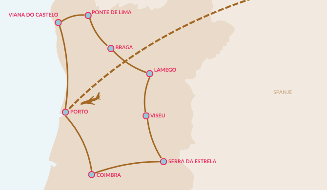Vandaag rijd je de laatste etappe van je reis: van het sfeervolle Coimbra terug naar het bruisende Porto. Wat is de tijd toch snel gegaan! Na al die bijzondere plekken, indrukwekkende landschappen en onvergetelijke ervaringen, komt je avontuur langzaam tot een mooi einde.