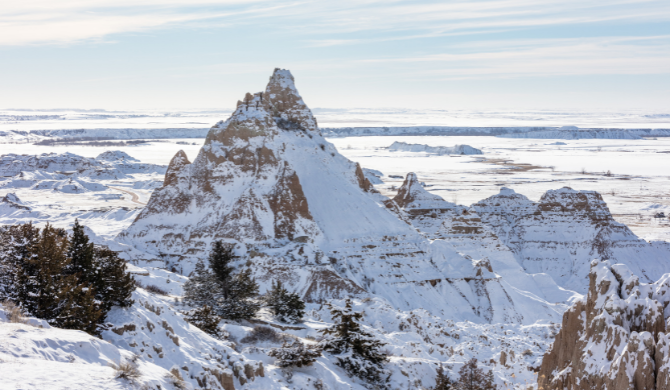 Sla alvast wat boodschappen in voor de komende dagen. Onderweg naar Badlands National Park spot je misschien al een deken van sneeuw over de rotsformaties. De temperaturen in deze regio kunnen flink zakken. In de winterperiode valt er regelmatig een pak sneeuw. Het park staat naast bijzondere rotsformaties ook bekend om zijn canyons. Ook in de winter is het mogelijk om wildlife te spotten. Rij over de hoofdweg door het park en kijk goed om je heen. Spot je een bizon?