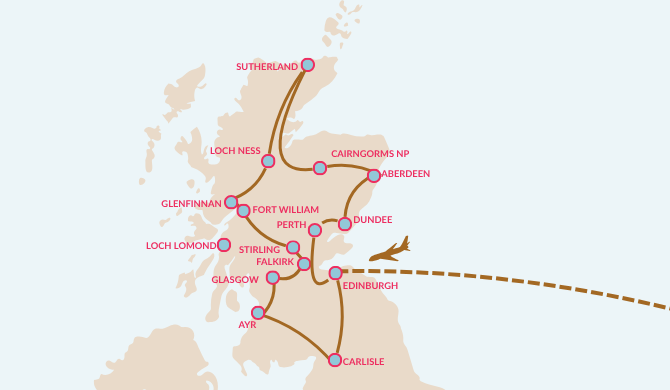 Deze 20-daagse camperreis laat je de hoogtepunten van Schotland ontdekken en is dé ultieme reisroute door deze prachtige regio. De reis start in Edinburgh waar je de eerste 2 nachten in het centrum zult verblijven. Nadat je de camper hebt opgehaald maak je kennis met de indrukwekkende landschappen van het zuiden van Schotland in de prachtige Scottish Borders. Vervolgens rijdt je de prachtige route van Carlisle naar Ayr en bezoek je het culturele centrum van Glasgow. Ook mag een bezoek aan Loch Lomond en The Trossachs National Park natuurlijk niet ontbreken. Of wat dacht je van Fort William? Maak hier een ritje met de stoomtrein en bezoek bij Glenfinnan het beroemde viaduct. Uiteraard staat ook Loch Ness op het programma en via Cairngorms National Park rijdt je richting Aberdeen. De reis eindigt weer in Edinburgh nadat je een mooie kustwandeling hebt gemaakt bij Dundee!